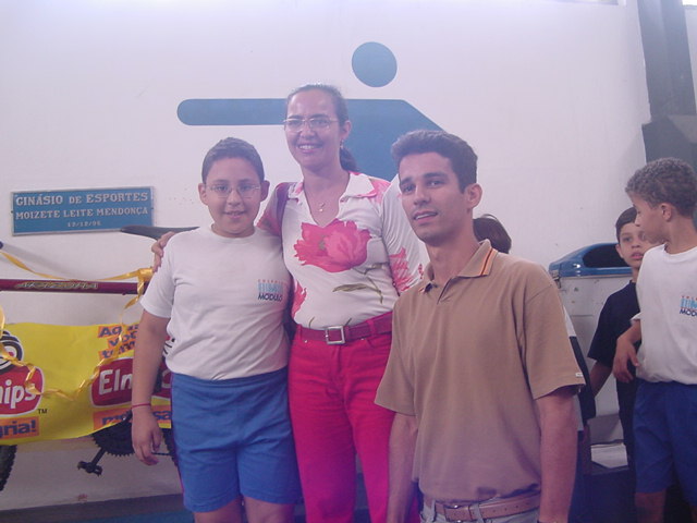 Fred, ao lado de sua mãe e do representante da Elma Chips